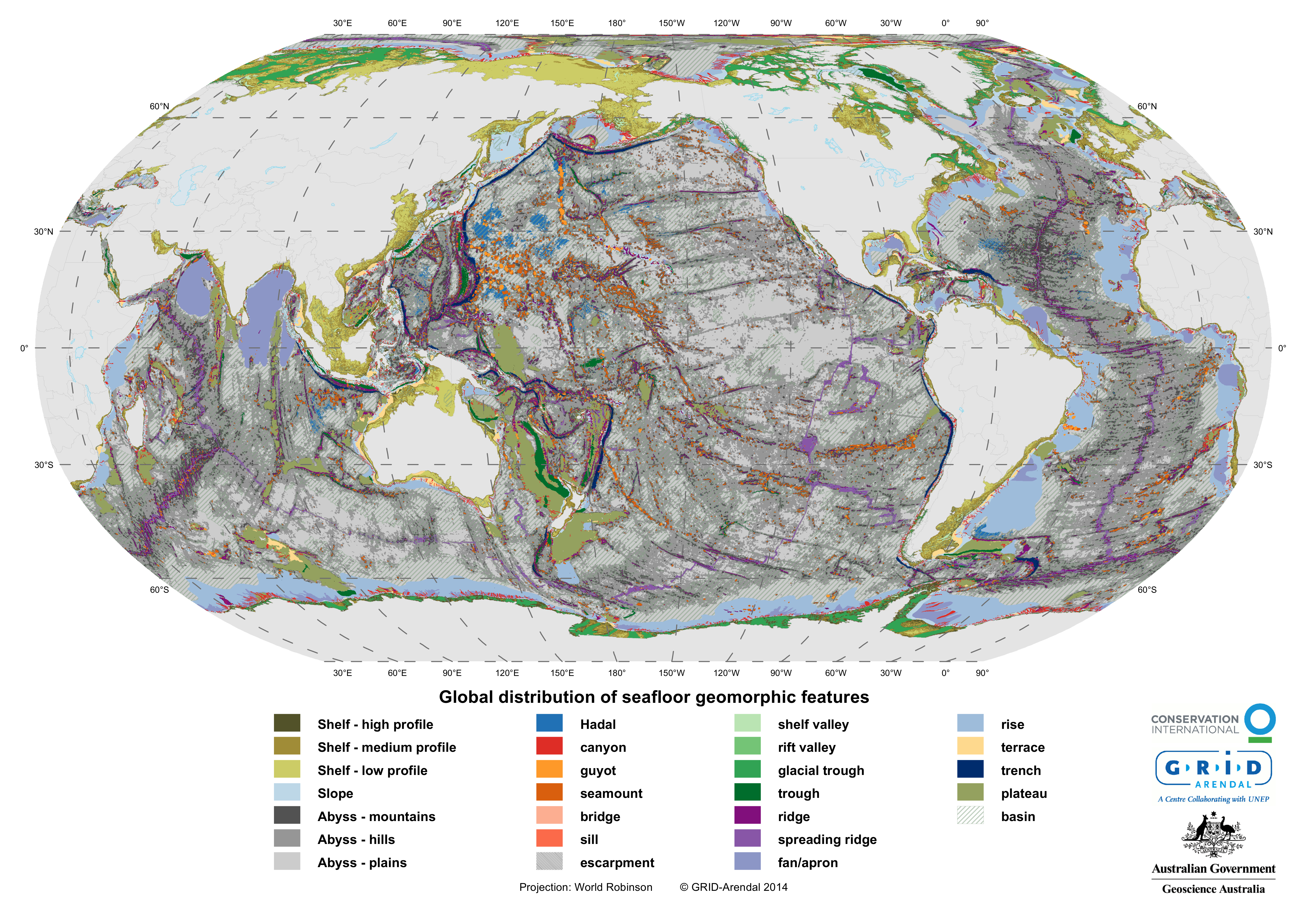 Conservation International, GRID-Arendal and Geoscience Australia recently collaborated to produce a map of the global distribution of seafloor geomorphic features. The global seafloor geomorphic features map represents an important contribution towards the understanding of the distribution of blue habitats. Certain geomorphic feature are known to be good surrogates for biodiversity. For example, seamounts support a different suite of species to abyssal plains. A detailed description and analysis of the global geomorphic features map can be found in in the scientific paper published in Marine Geology (http://dx.doi.org/10.1016/j.margeo.2014.01.011). The map and the underlying spatial data can be accessed from this website.